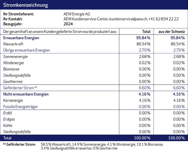 Einmal jährlich informieren wir über die Herkunft des im Vorjahr gelieferten Stroms. Ausgewiesen werden dabei die Anteile der eingesetzten Energieträger sowie die Herkunft der Elektrizität (Produktion im Inland oder Ausland).