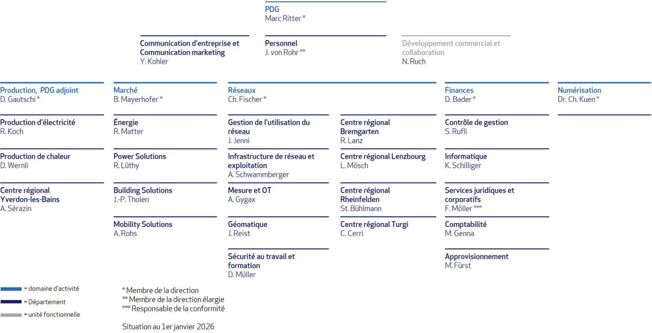 AEW Energie AG est structurée en cinq secteurs : production, marché, réseaux, finances et numérisation.
