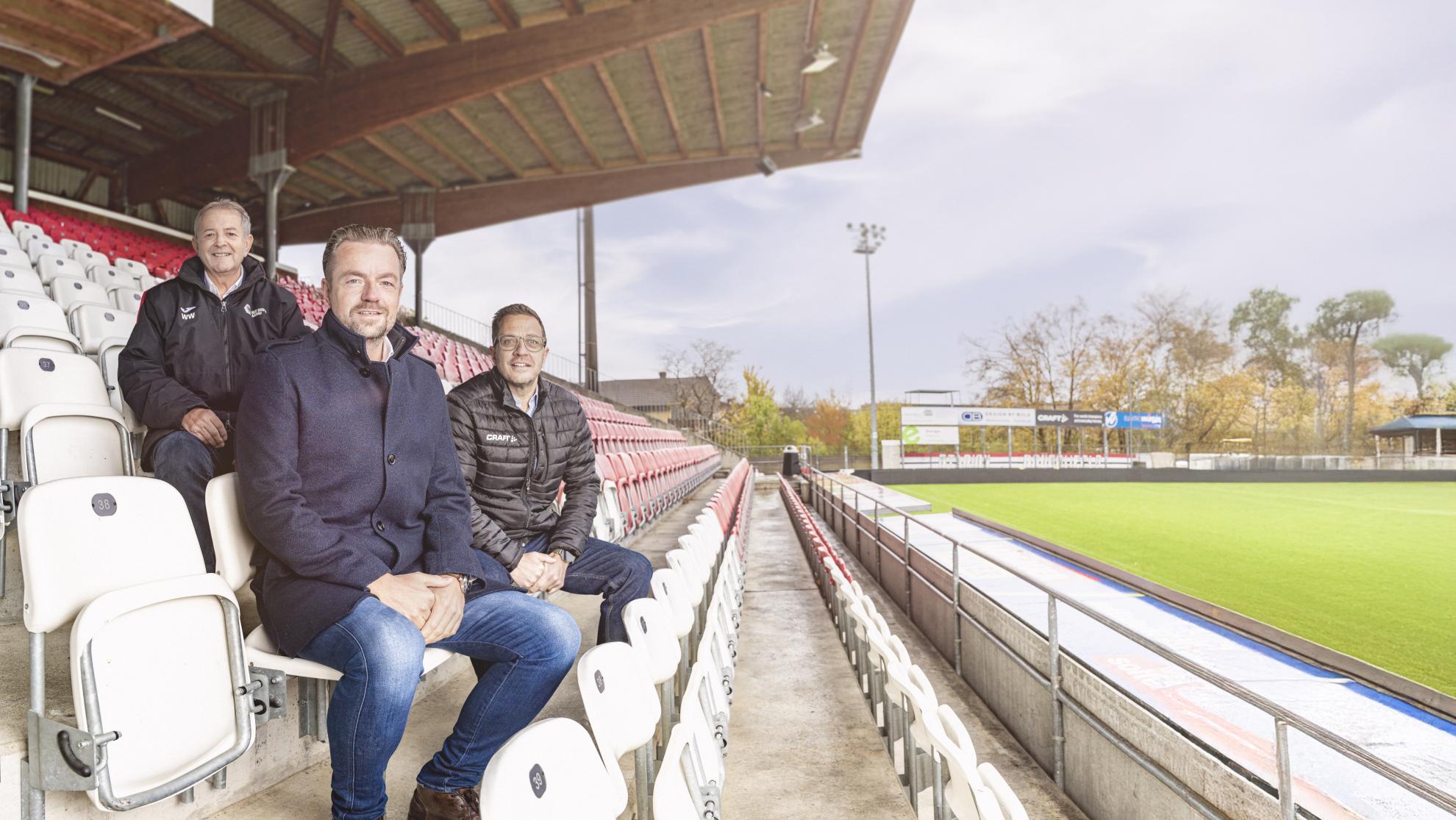 Willy Wenger (Red Boots), Marc Ritter (AEW) und Markus Mahler (FC Aarau) auf der Haupttribüne im Brügglifeld (v.l.n.r.)