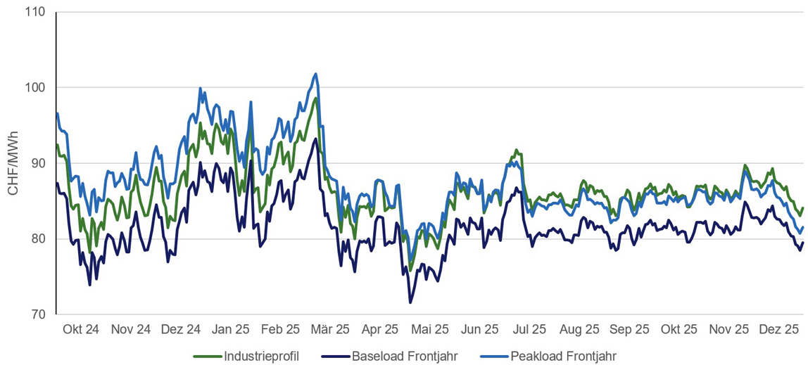 Ende Oktober war die Residuallast zunächst äusserst niedrig aufgrund der starken Windeinspeisung in Deutschland. Die Spotpreise blieben bis Mitte November im Tagesdurchschnitt grösstenteils unter 100 CHF/MWh. Ab Mitte November war der Spotmarkt hingegen mehrheitlich von einzelnen Dunkelflauten geprägt, was die Preise zeitweise deutlich steigen liess. Beispielsweise erreichte der Spotpreis am 26.11. in der Abendrampenstunde eine Spitze von fast 300 CHF/MWh.