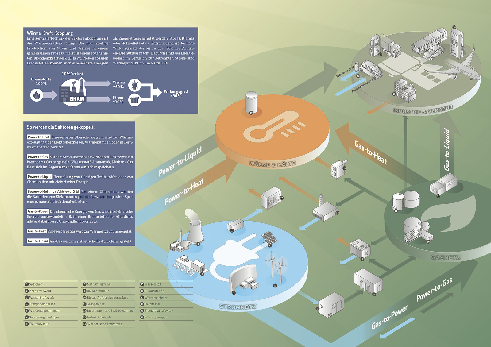 Die verschiedenen Energiesektoren wurden bis anhin getrennt betrachtet. Um die erneuerbaren Energiequellen optimal zu integrieren und Synergien zu nutzen, müssen die verschiedenen Netze zusammenwachsen. Der Sektor Strom ist Kern und Ausgangspunkt in einem gekoppelten Versorgungsnetz. Denn um fossile Brennstoffe wie Gas, Kohle und Benzin zu ersetzen, muss Strom in Zukunft auch für Verkehr und Wärme genutzt werden. Die Sektorenkopplung ist dabei ein vielversprechender Lösungsweg für eine Dekarbonisierung unserer Energieerzeugung und unseres Energieverbrauchs.