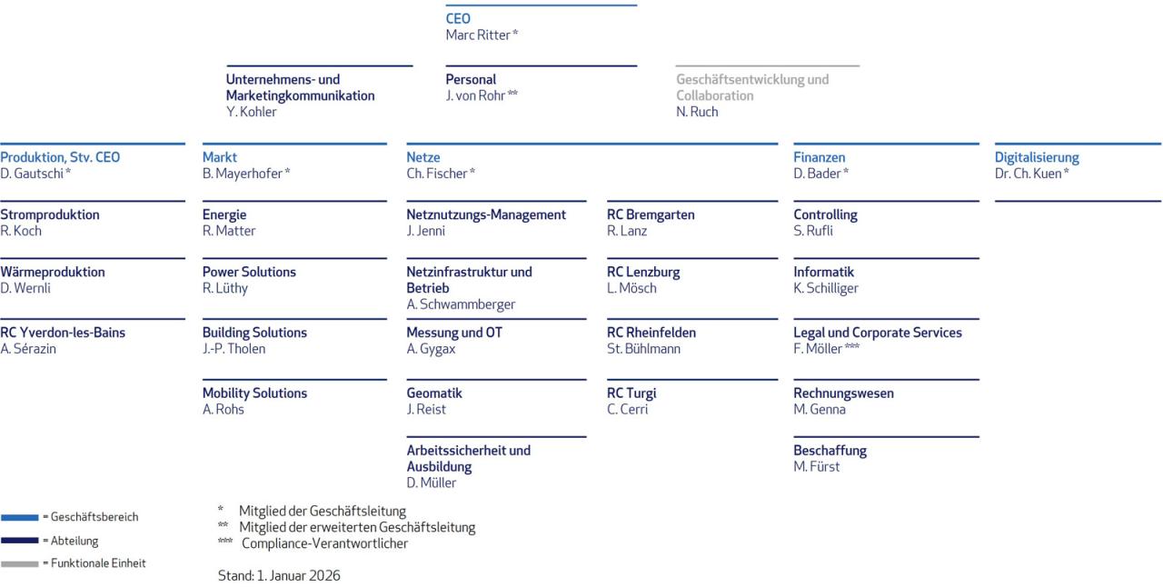 Die AEW Energie AG ist in die fünf Bereiche Produktion, Markt, Netze, Finanzen und Digitalisierung gegliedert.